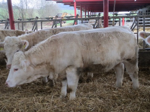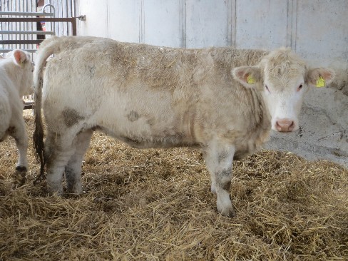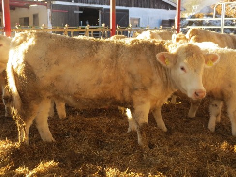 Annabelle ist ein rahmiges Jungrind mit einer sehr guten Bemuskelung vom französischen Besamungsbullen Urfe aus einer Bacchus-Enkelin. Sie ist breit angelegt, hat gute tägliche Zunahmen und ein korrktes Fundament mit sehr schöner Oberlinie.