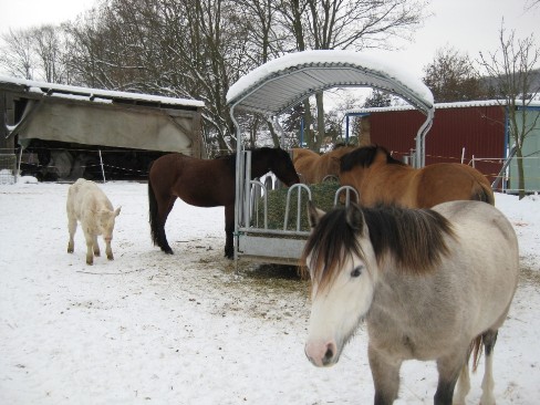 Im Winter werden die Ponys durch die Unterbringung direkt am Hof und die Heufütterung mit Hilfe von Trecker oder Lader auch an größere Maschinen und laute Geräusche gewöhnt.