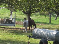 Unsere Sommerweiden, die nicht direkt an den Hof angrenzen verfügen über großzügigen Baumbestand, der es den Tieren stets ermöglicht, Schatten aufzusuchen. Getränkt wird dort über einen Wasserwagen mit Selbsttränke. Um das Bedürfnis nach strukturhaltigem Rauhfutter stets zu befriedigen, wird auch auf den Sommerweiden Heu aus der Palisadenraufe zugefüttert.
