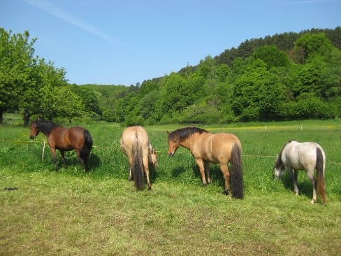 Wir möchten unseren Ponys eine möglichst artgerechte Haltung, die ihren Bedürfnissen nach Sozialkontakten, Bewegung, ständiger Rauhfutteraufnahme und Frischluft entspricht, bieten. Deshalb halten wir unsere Ponys 24 Stunden am Tag 365 bzw. 366 Tage im Jahr in der Gruppe.