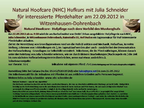 Nicht nur der durchdachte Offenstall, sondern auch Weiterbildung rund um Pferdewissen gehören zur Pferdehaltung. Wir konnten unsere engagierte Hufbearbeiterin, Julia Schneider, überzeugen ,bei uns vor Ort eine Tagesseminar rund um das Basiswissen zum Pferdehuf zu geben. Am 22.09.2012 ist es soweit. Es ist der erste Kurs bei uns auf dem Hof und wir hoffen auf gutes Wetter, viele Infos, Erfahrungsaustausch und natürlich viel Spaß.