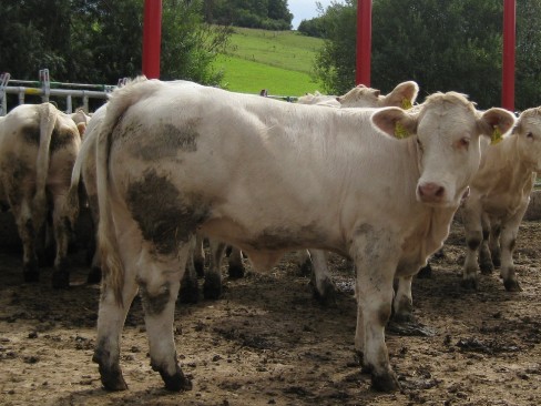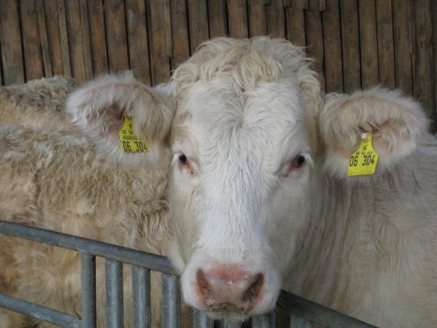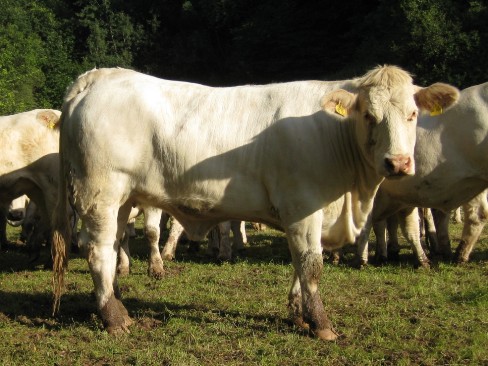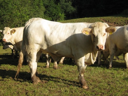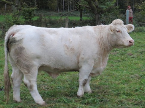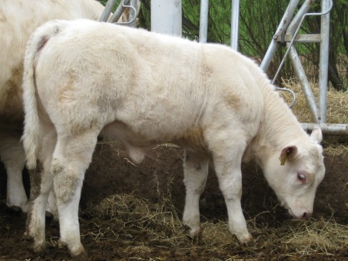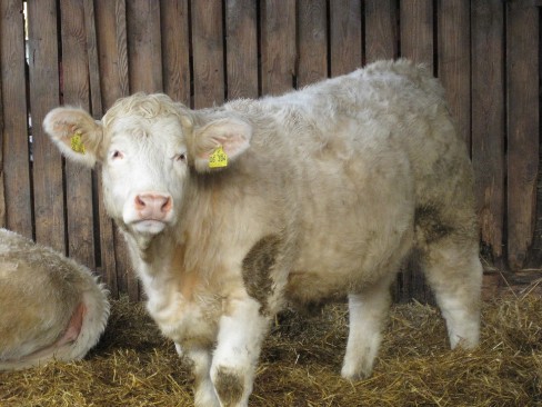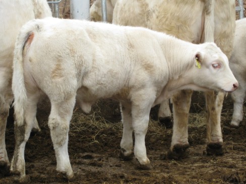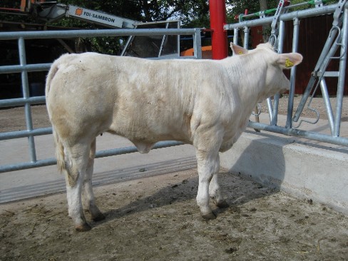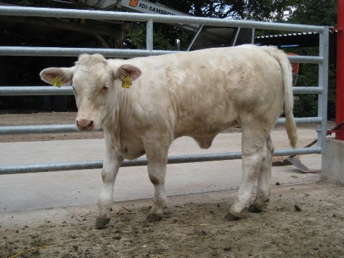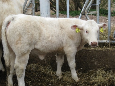 Vinchen entspricht genau dem, was man sich von einem guten Charolais-Kalb wünscht: ein geringes Geburtsgewicht, aber eine enorme Entwicklung. Sie besticht durch eine sehr gute Bemuskelung, ein korrektes Fundament mit einem sehr guten Becken und durch ihr sehr anhängliches Wesen.
